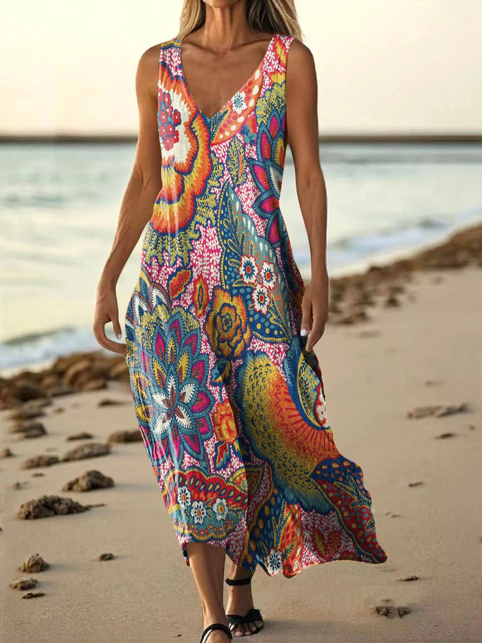 Women's Colorful Folk Flower Art Print V-neck Sleeveless Pocket Cotton Dress