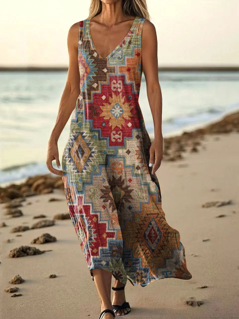 Women's National Totem Folk Art Print V-neck Sleeveless Pocket Cotton Dress