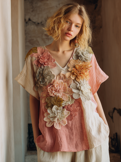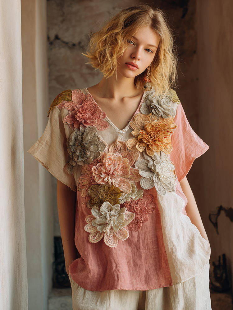 Women's Retro Floral Gradient Pattern V- Neck Short Sleeve T-shirt