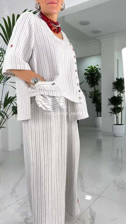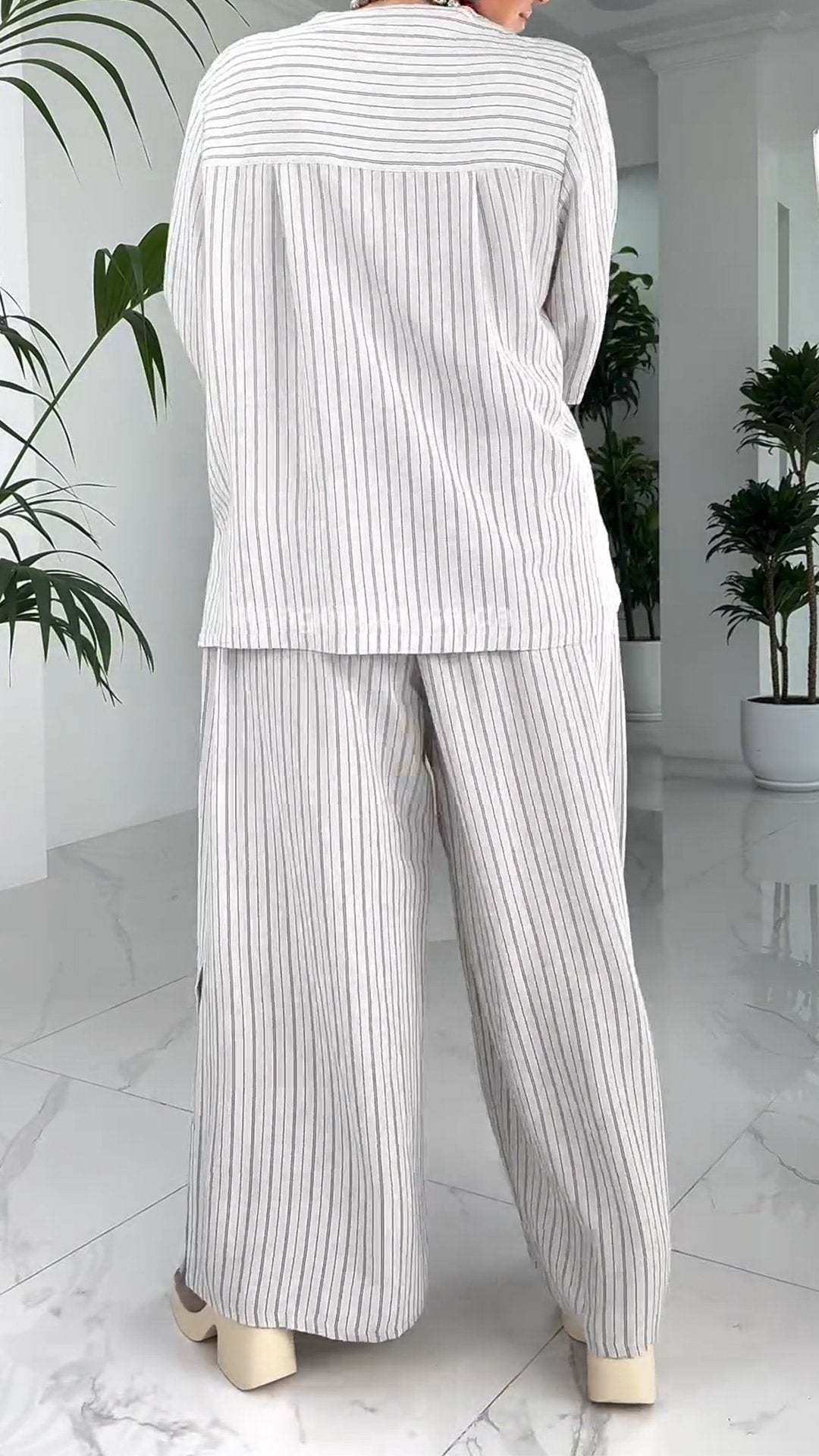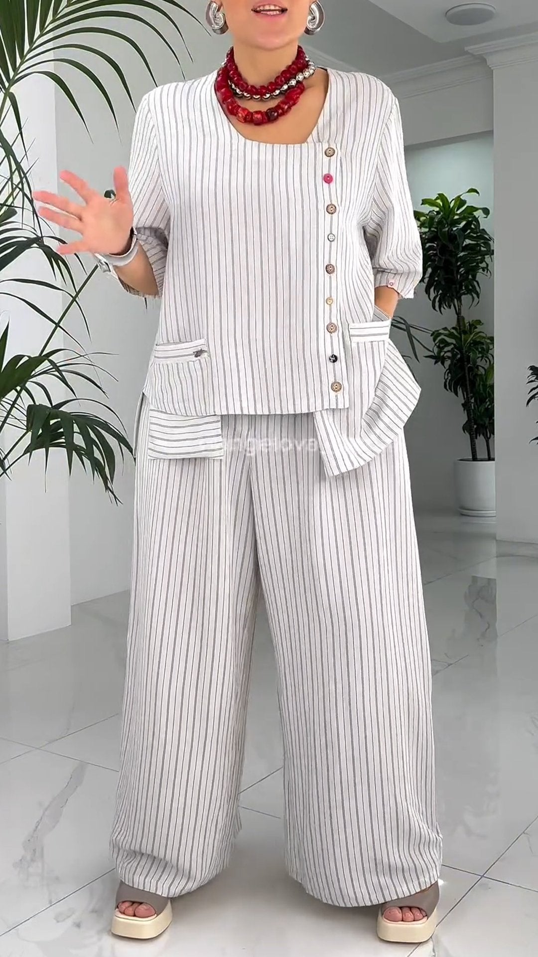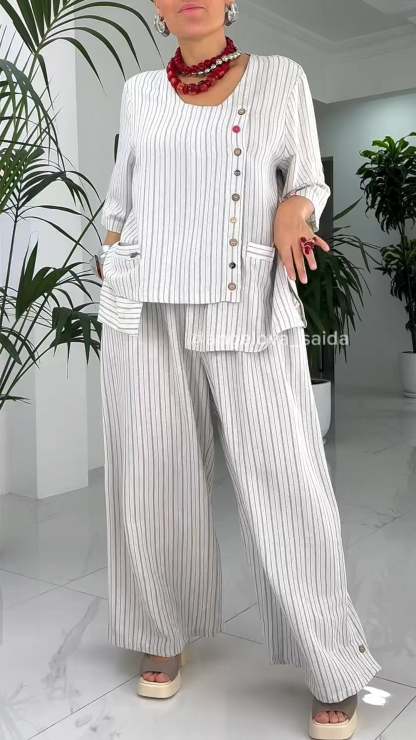Women's Round Neck Mid-length Sleeve Striped Casual Suit