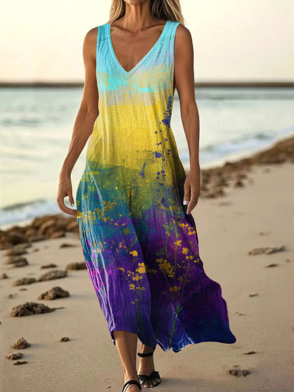 Women's Vintage Floral Art Print Pocket Cotton Dress