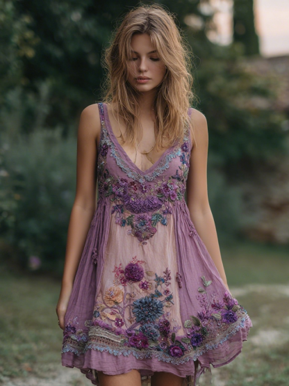 Women's Vintage Purple Lavender Floral Stitching Casual Dress