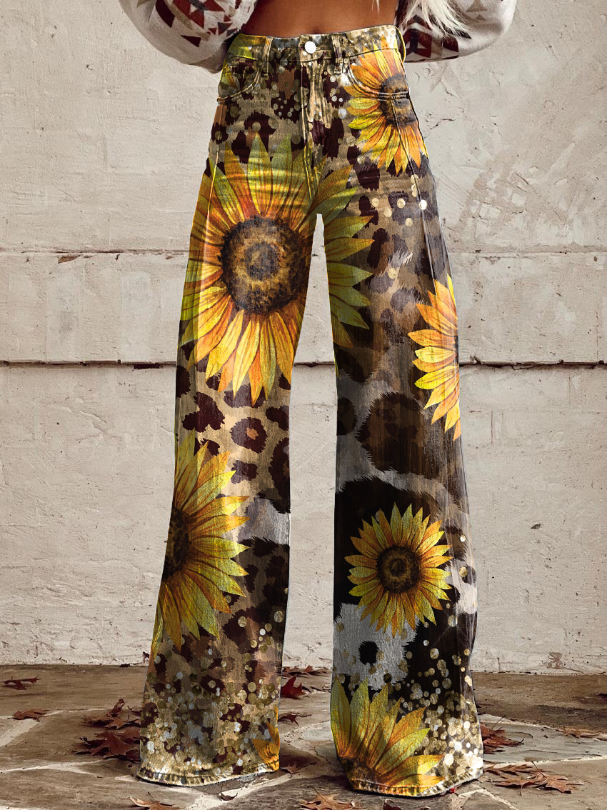 Women's Vintage Sunflower Leopard Print Casual Wide Leg Pants
