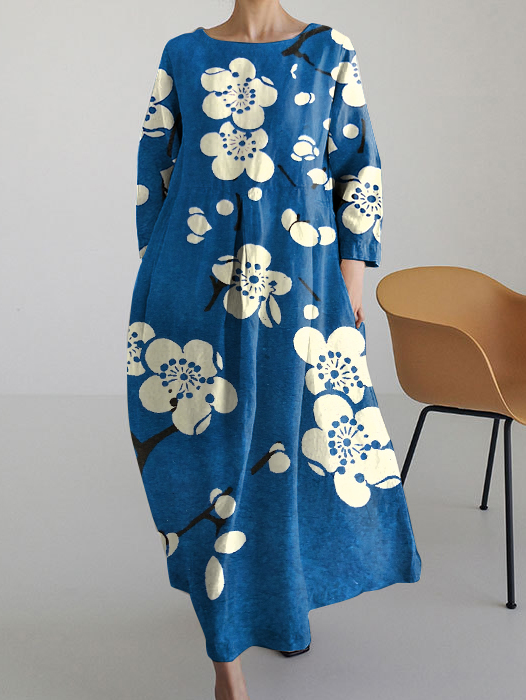 Japanese Plum Blossom Art Retro Long-sleeved Loose Midi Dress