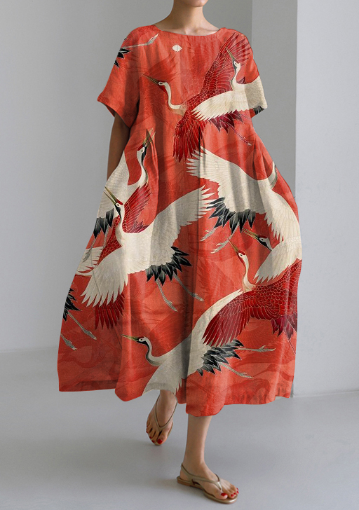 Japanese Style Crane Round Neck Short Sleeve Midi Dress