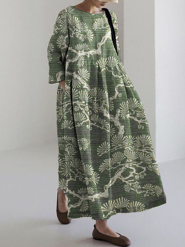 Pine Trees Japanese Lino Art Linen Blend Maxi Dress