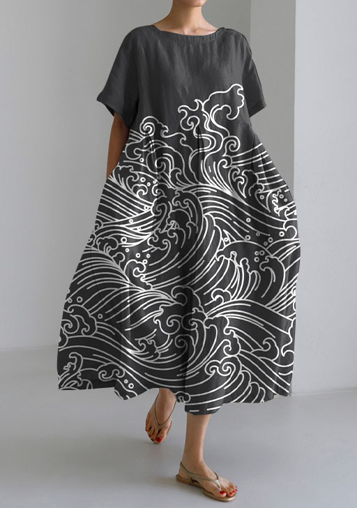 Japanese Sea Wave Print Linen Blend Cozy Maxi Dress
