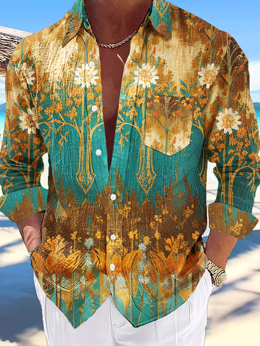Gentleman Vintage Gradient Geometric Floral Art Print Long Sleeve Pocket Shirt