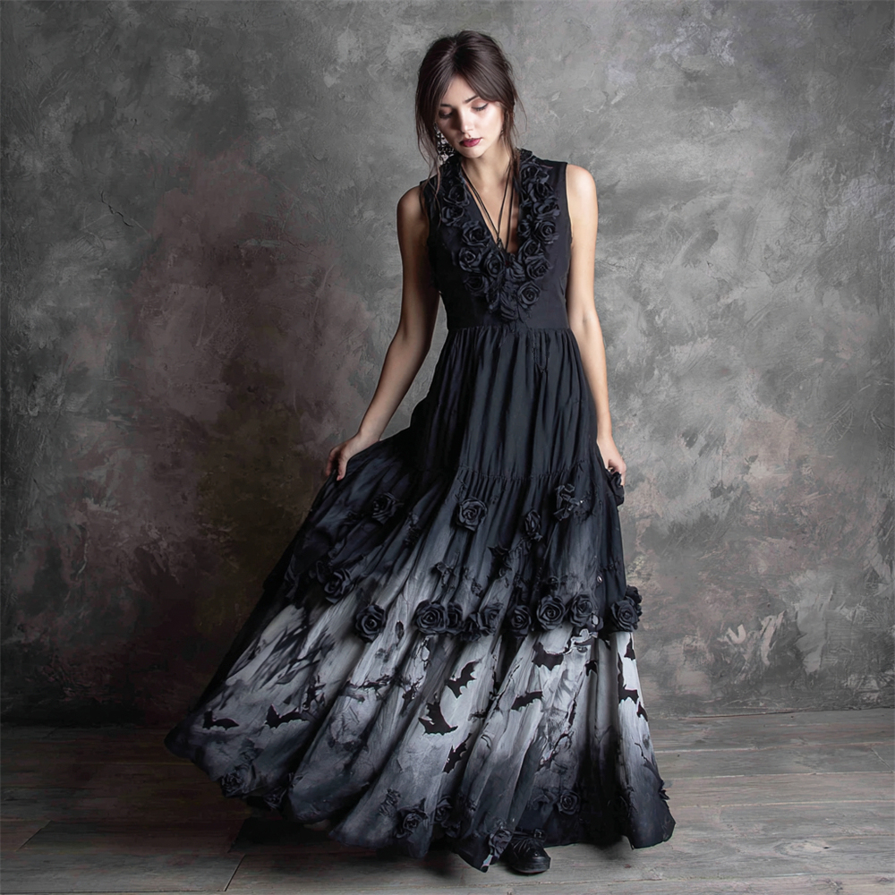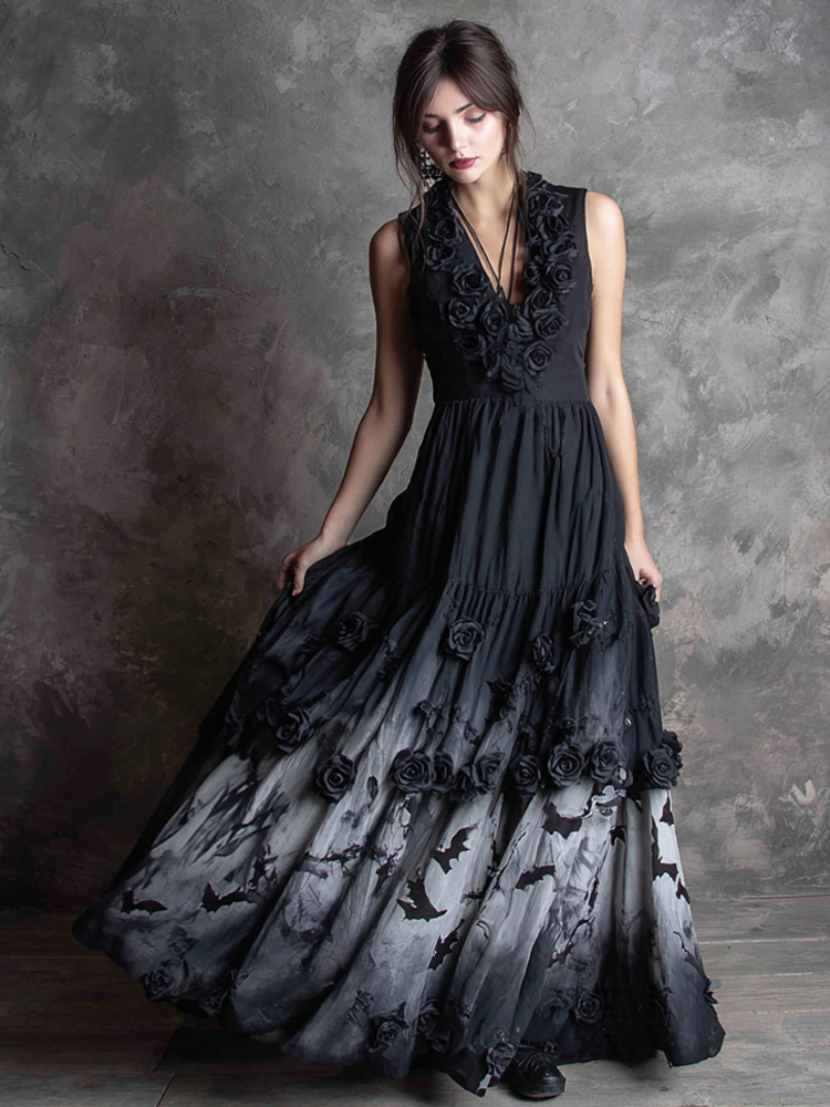 Halloween Bat Floral Gothic Art Women's Vest Flutter Maxi Dress