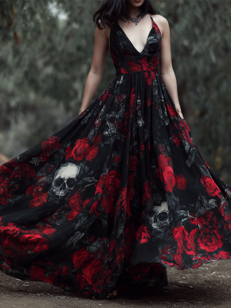 Halloween Gothic Dark Style Skeleton Element Women's V-neck Long Dress