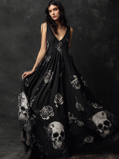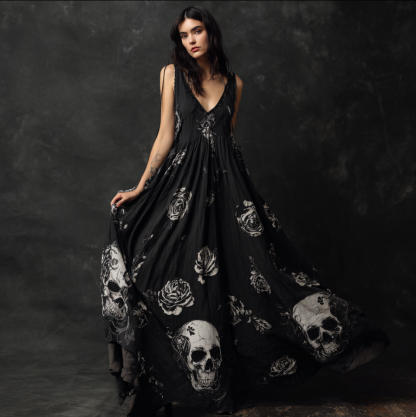 Halloween Gothic Dark Style Skeleton Element Women's V-neck Long Dress