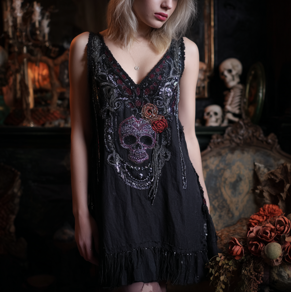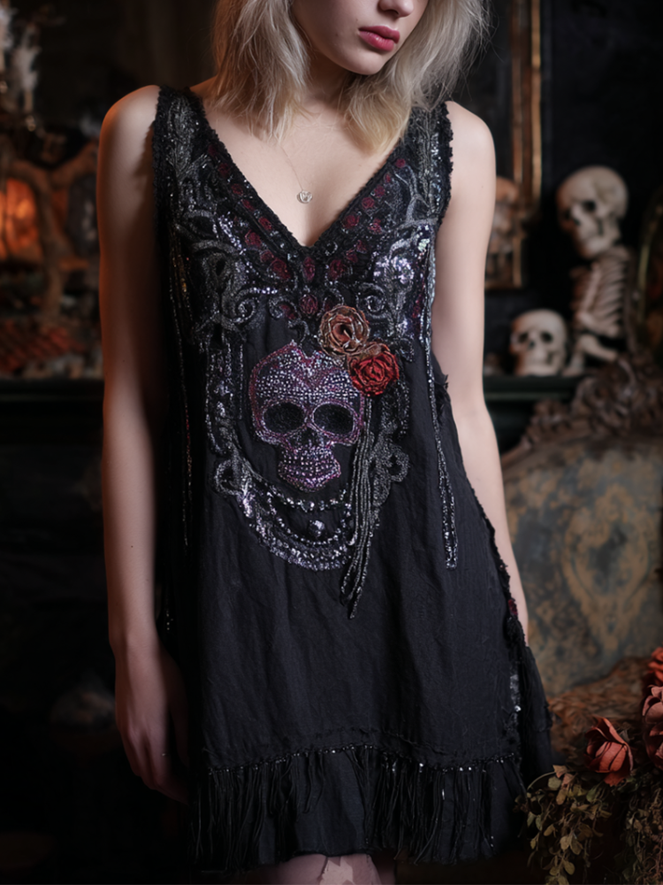 Halloween Skeleton Element V-neck Short Sleeve Dress