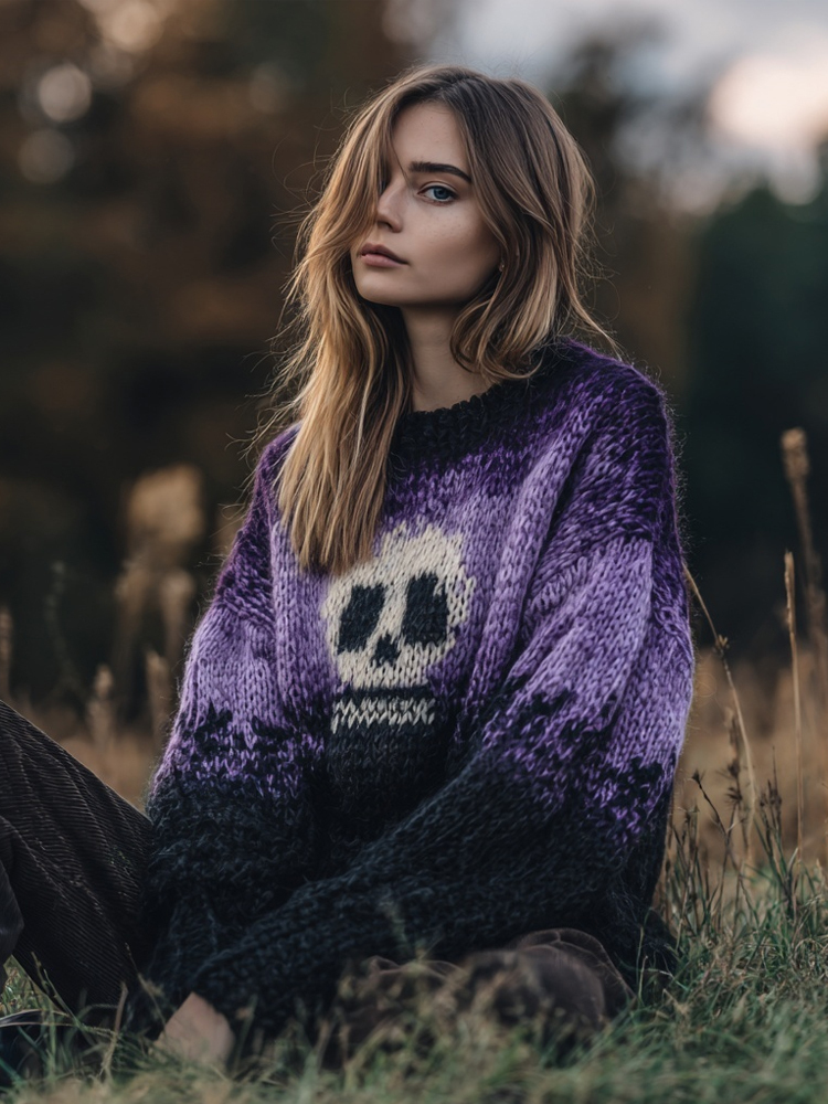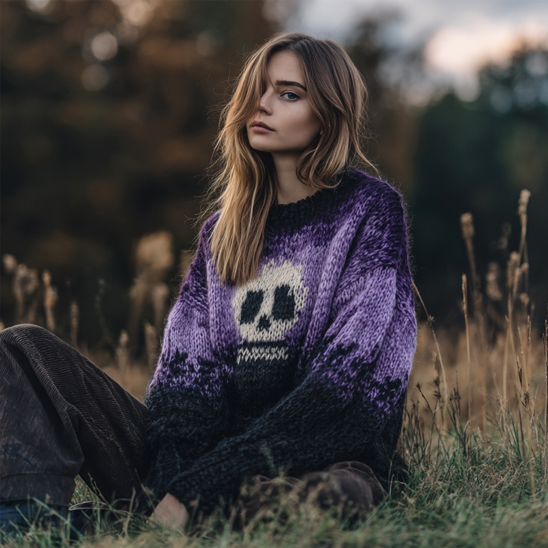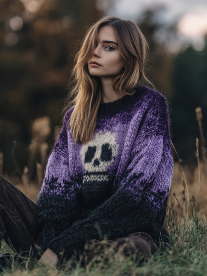 Halloween Skull Pattern Purple Gradient Cozy Knit Sweater