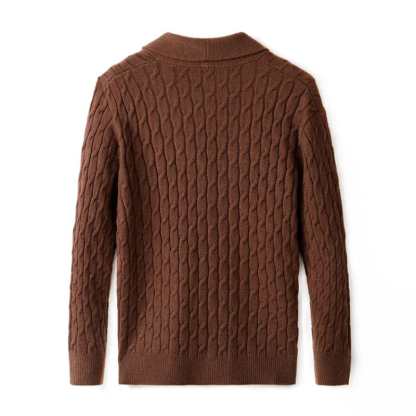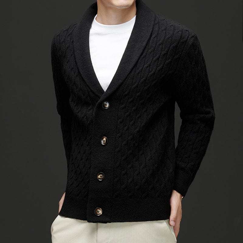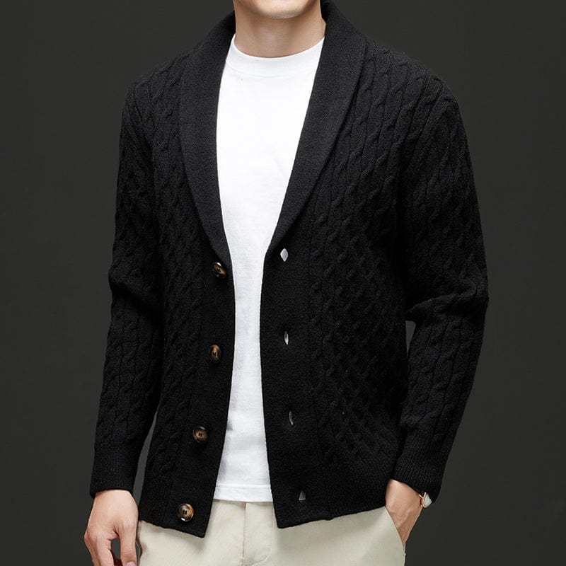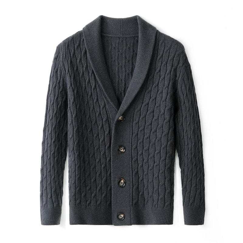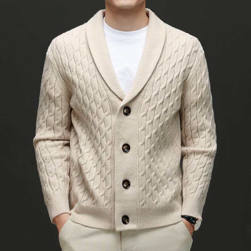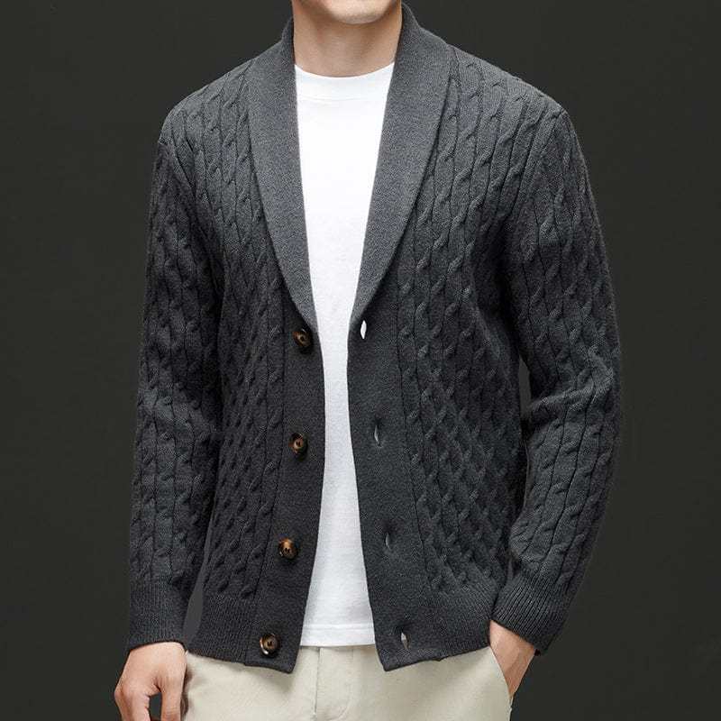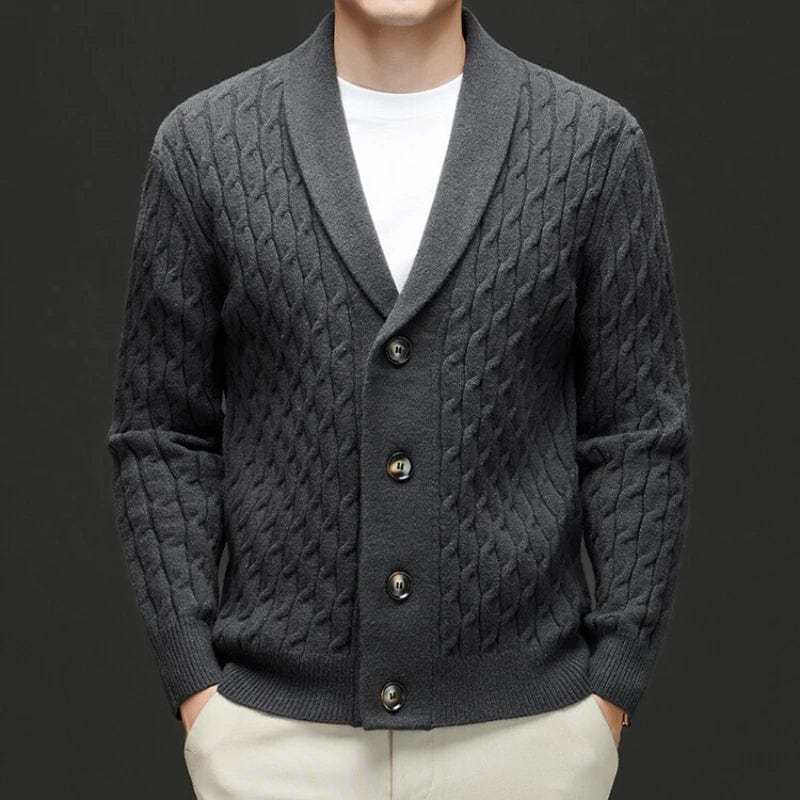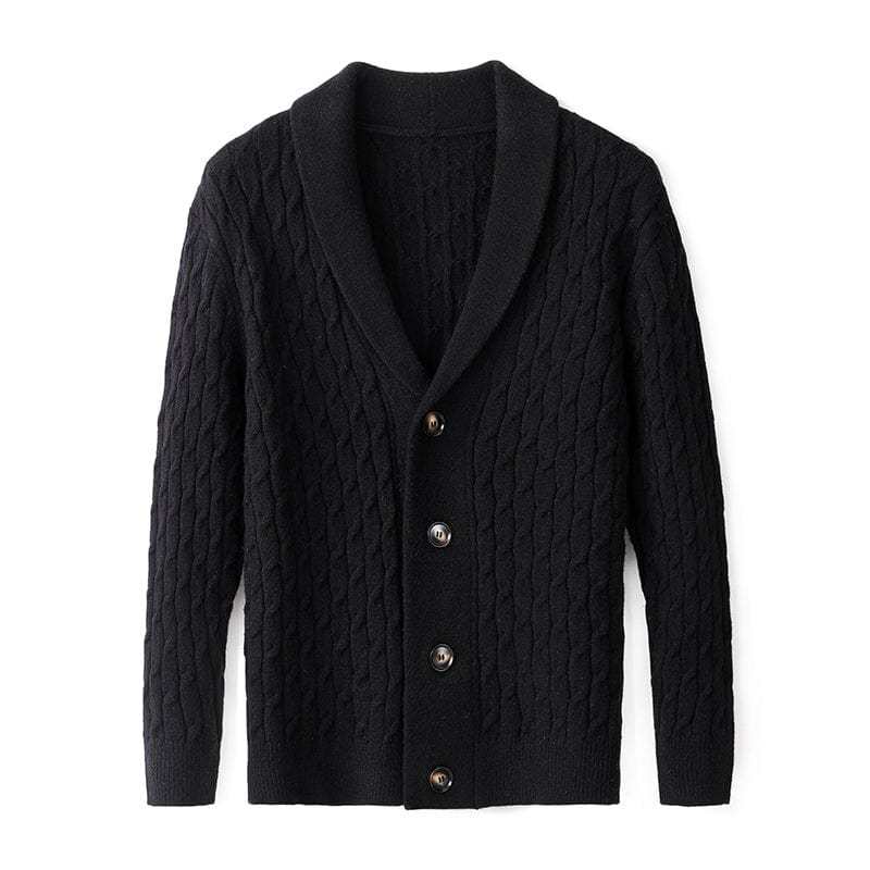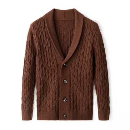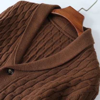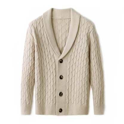 Crafted from luxuriously soft merino wool, this cardigan delivers superior warmth and comfort with an elevated touch. The intricate cable-knit design and tailored shawl collar make it a versatile winter essential for both casual and refined looks.