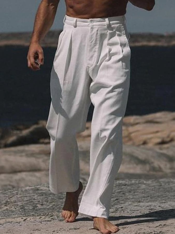 Men's Casual Solid Color Cotton And Linen Trousers With Pockets
