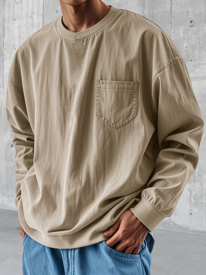 Men's Fashionable Round Neck Casual Pocket Long Sleeve Tops