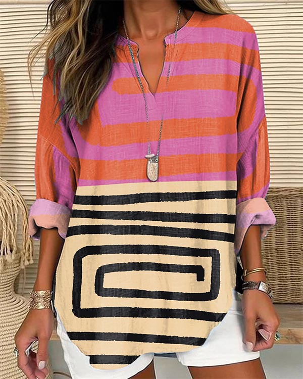 Retro Abstract Painting Art Print Loose V-Neck Long Sleeve Top