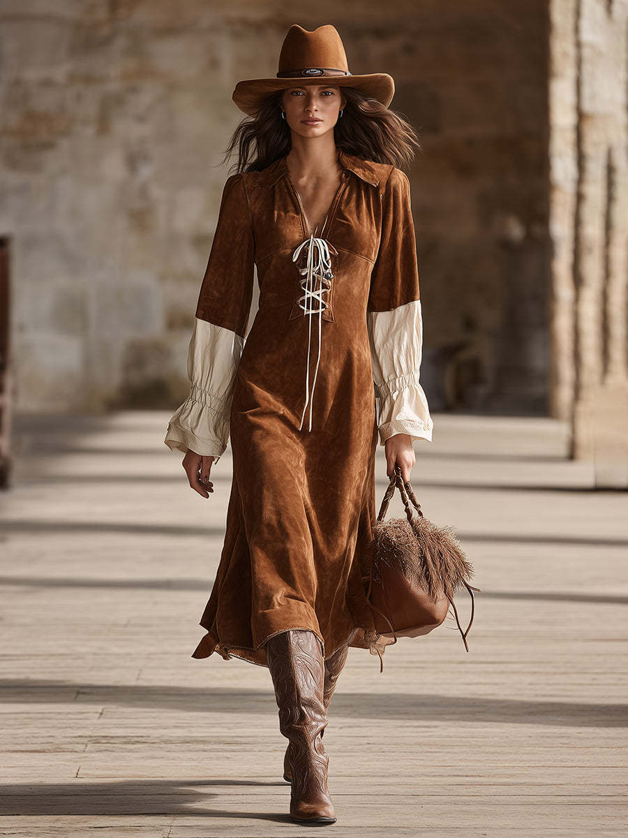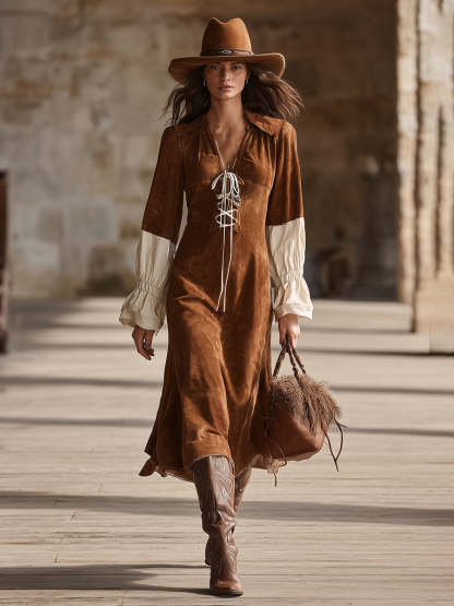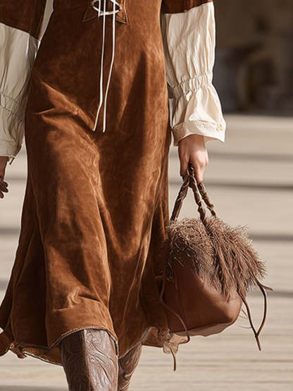 Retro Bohemian Brown Faux Suede Color Block Beige Long-Sleeved Maxi Dress