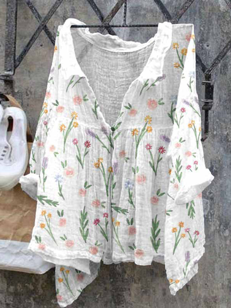 Retro Lovely Floral Print Casual Cotton Linen Shirt