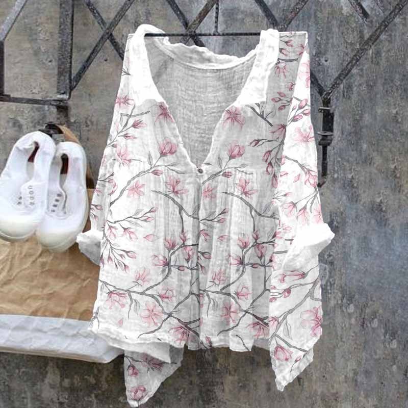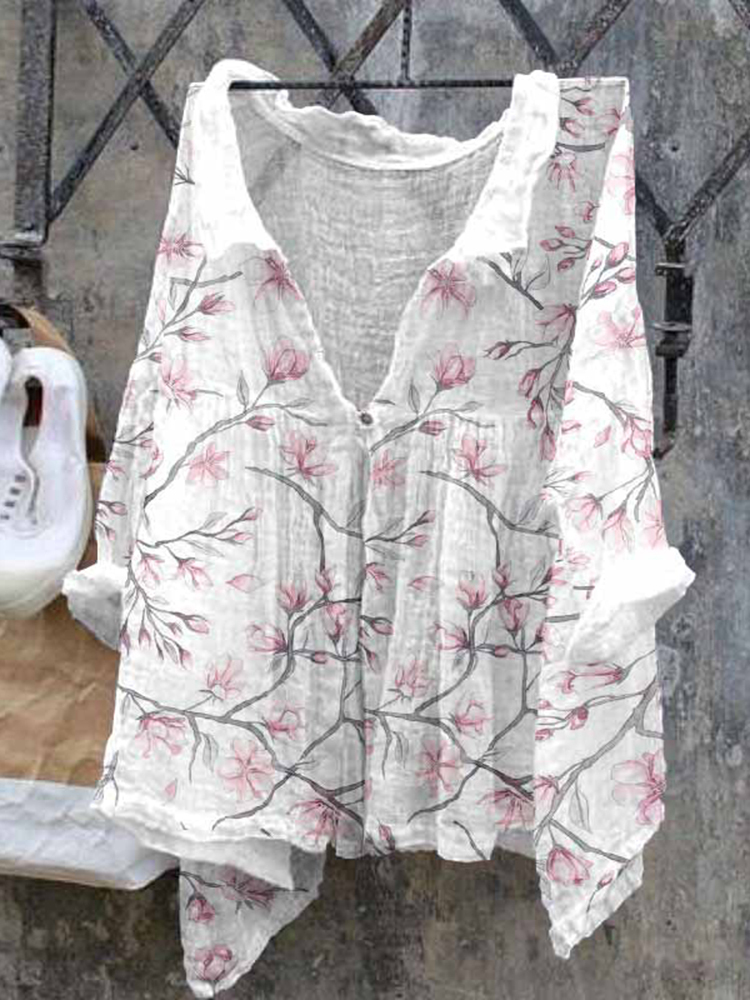 Retro Pink Floral Print Casual Cotton Linen Shirt