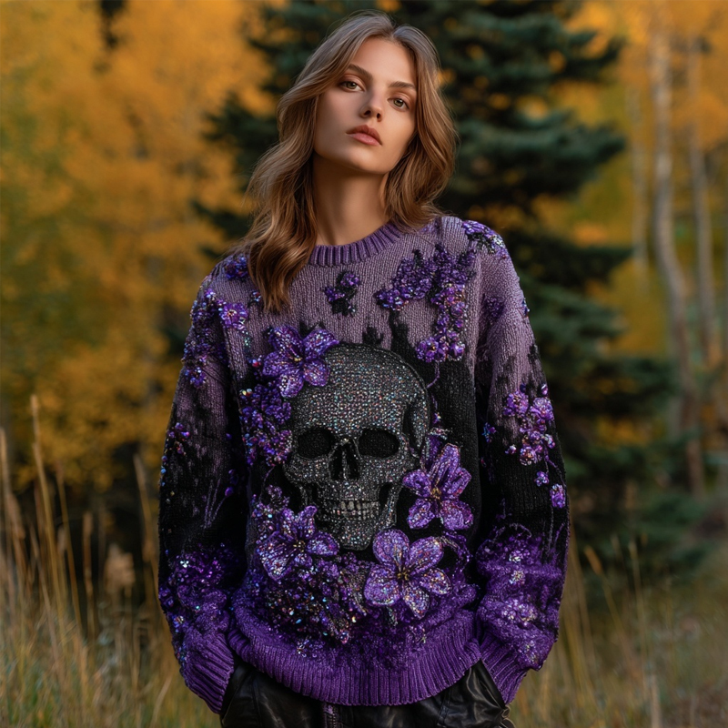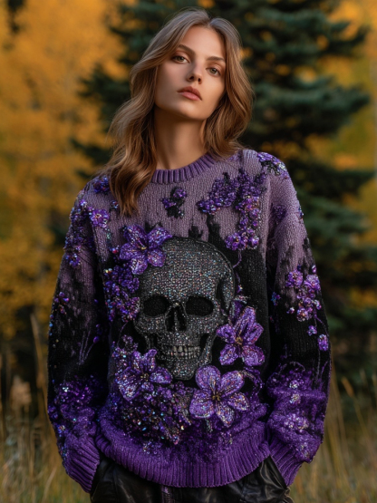 Vintage Glitter Skull & Flowers Embroidered Cozy Knit Sweater