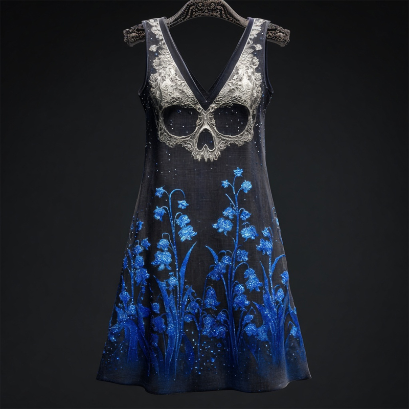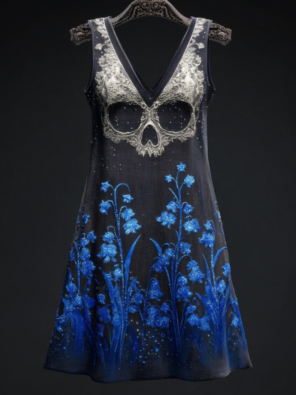 Vintage Lily Of The Valley & Skull Embroidered Linen Mini Dress
