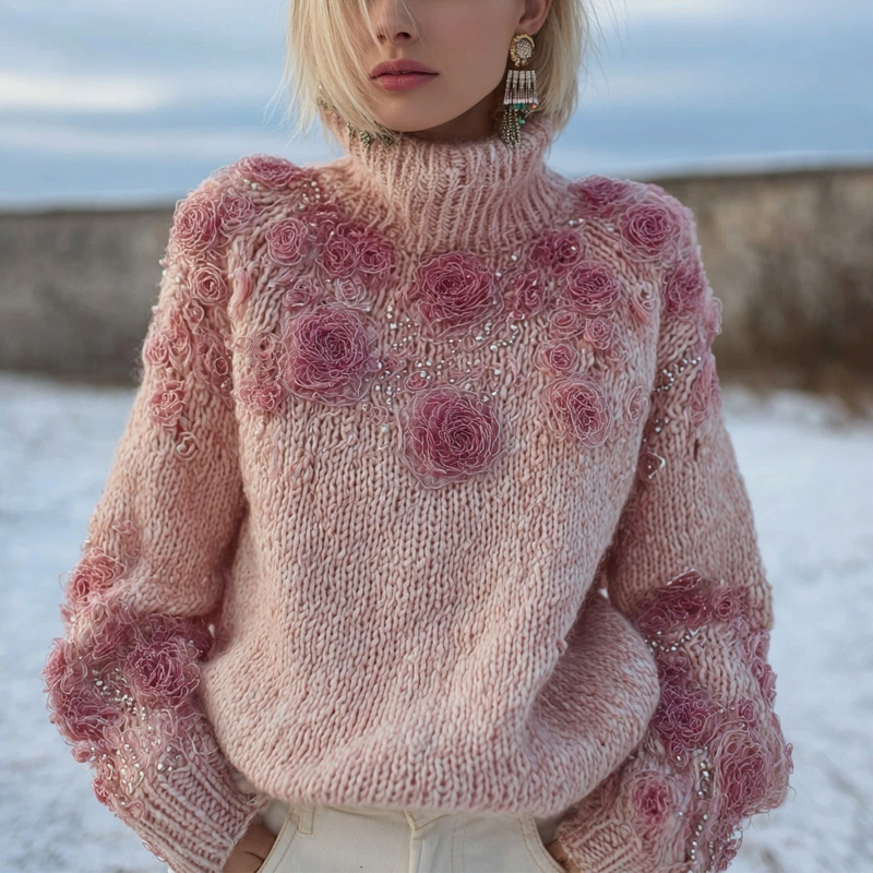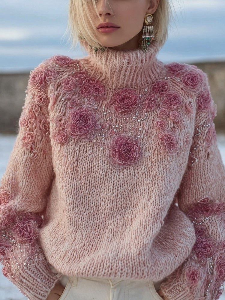 Vintage Pink Roses Embroidered Cozy Knit Turtleneck Sweater