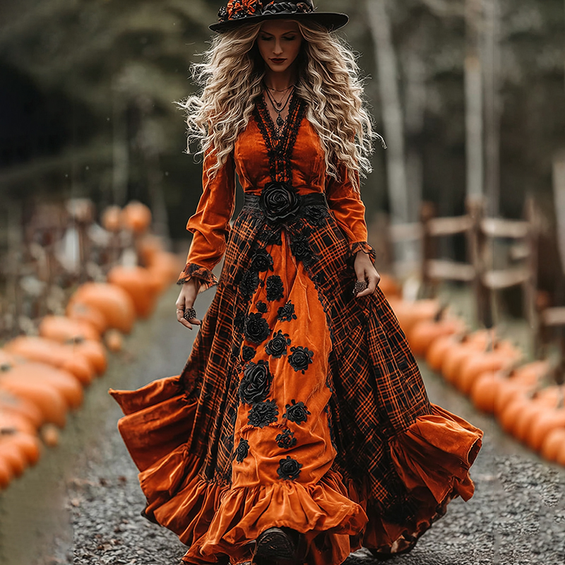Women's Classic Halloween Black Roses And Orange Plaid Art Comfy Velvet Maxi Dress