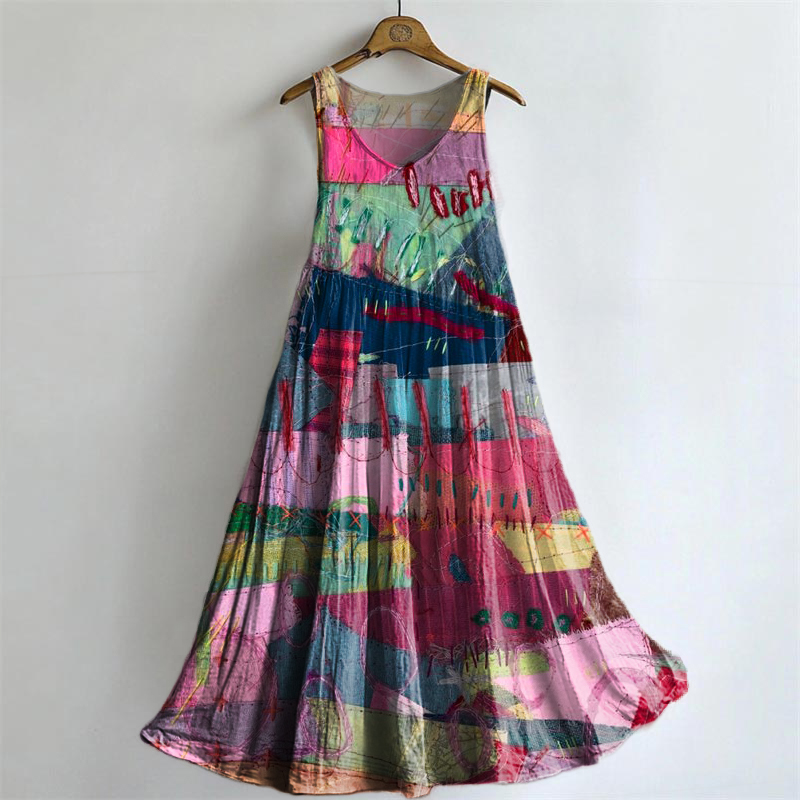 Women's Colorful Patchwork Pattern Art Print Round Neck Sleeveless Cotton Pocket Dresses