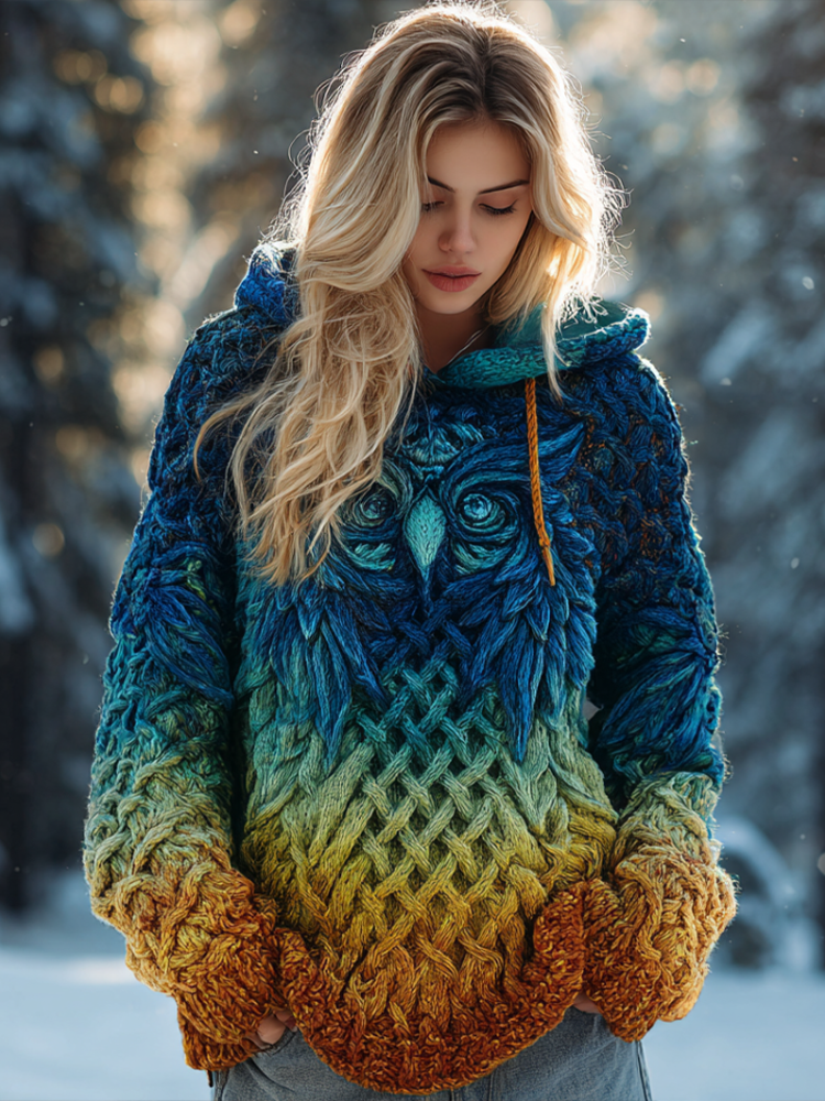 Women's Gradient Color Hooded Long Sweater With Viking Style Tribal Totem