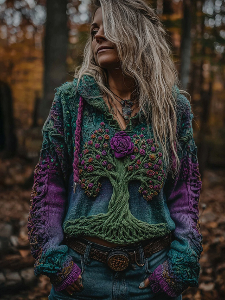 Women's Retro Life Of Tree Gradient Art Knit Hooded Sweater