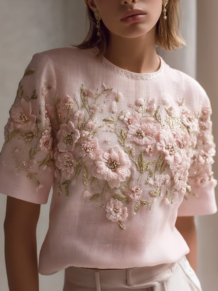Women's Retro Pink Floral Embroidery Art Print Crew Neck Short Sleeve T-shirt