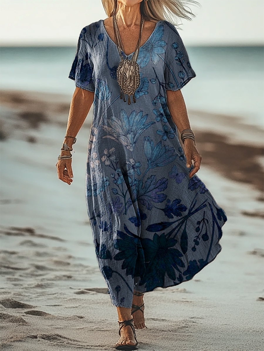 Women's Simple Flower Art Print V Neck Pocket Cotton Dress