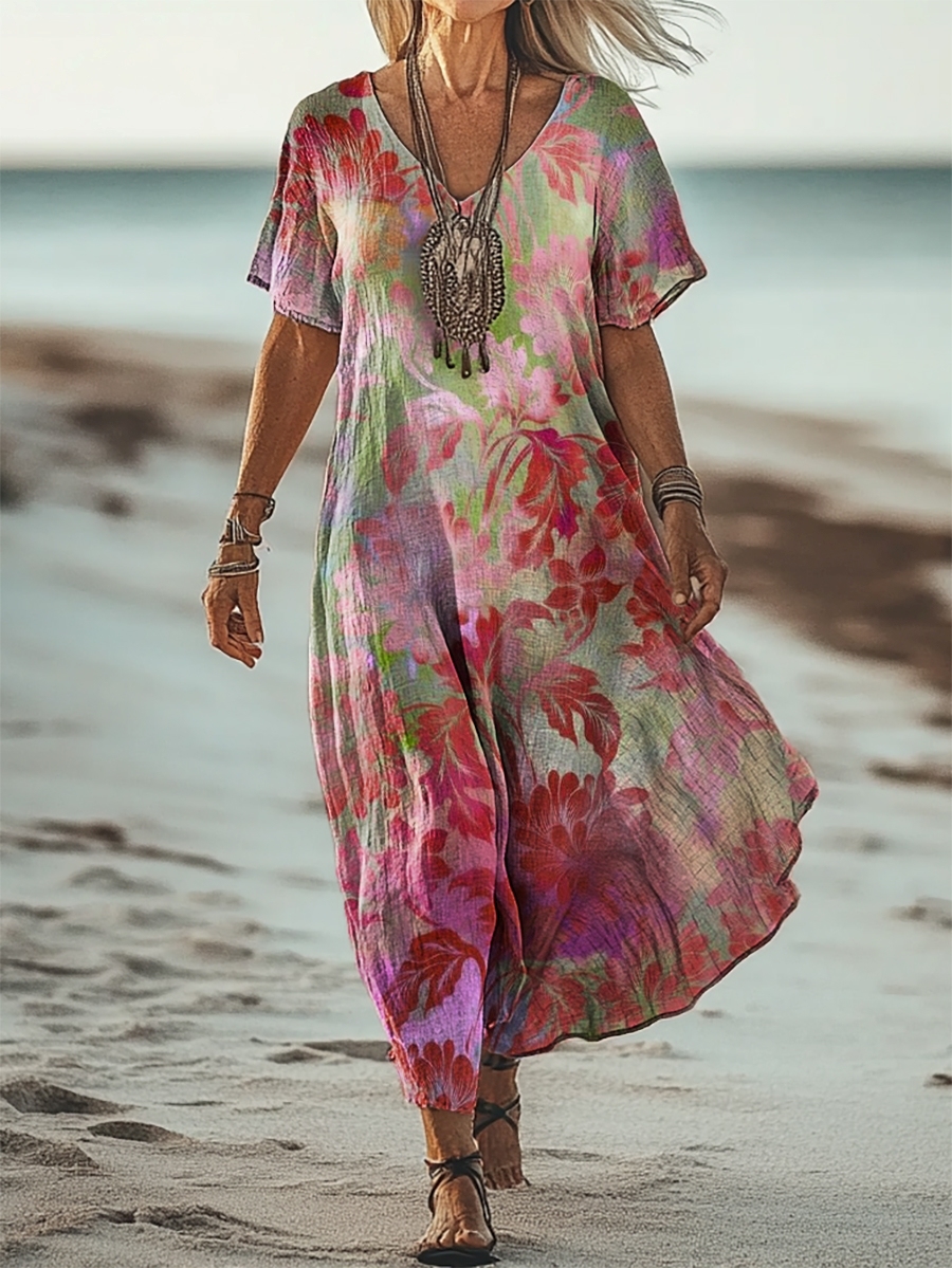 Women's Simple Retro Gradient Floral Art Print V Neck Pocket Cotton Dress