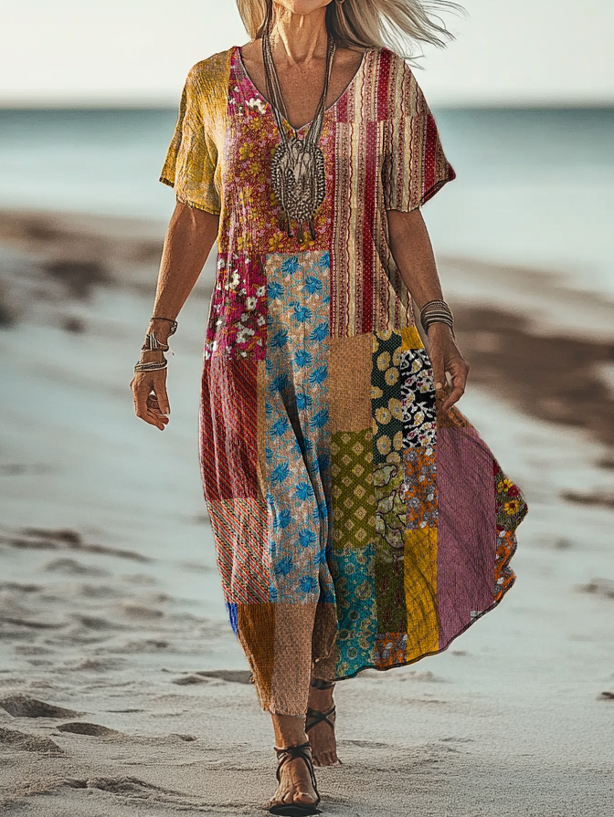 Women's Vintage Ethnic Floral Art Print Pocket Cotton Dress