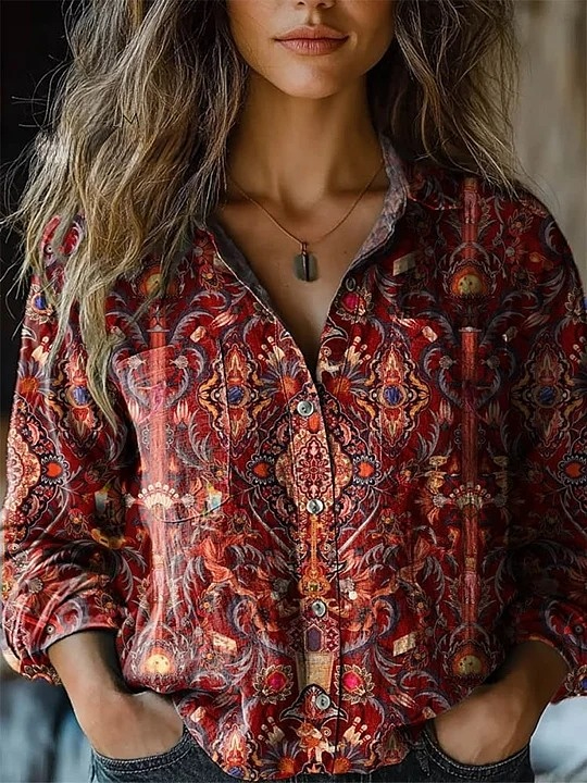 Women's Vintage Ethnic Pattern Art Print Casual Long Sleeve Comfortable Cotton Shirt