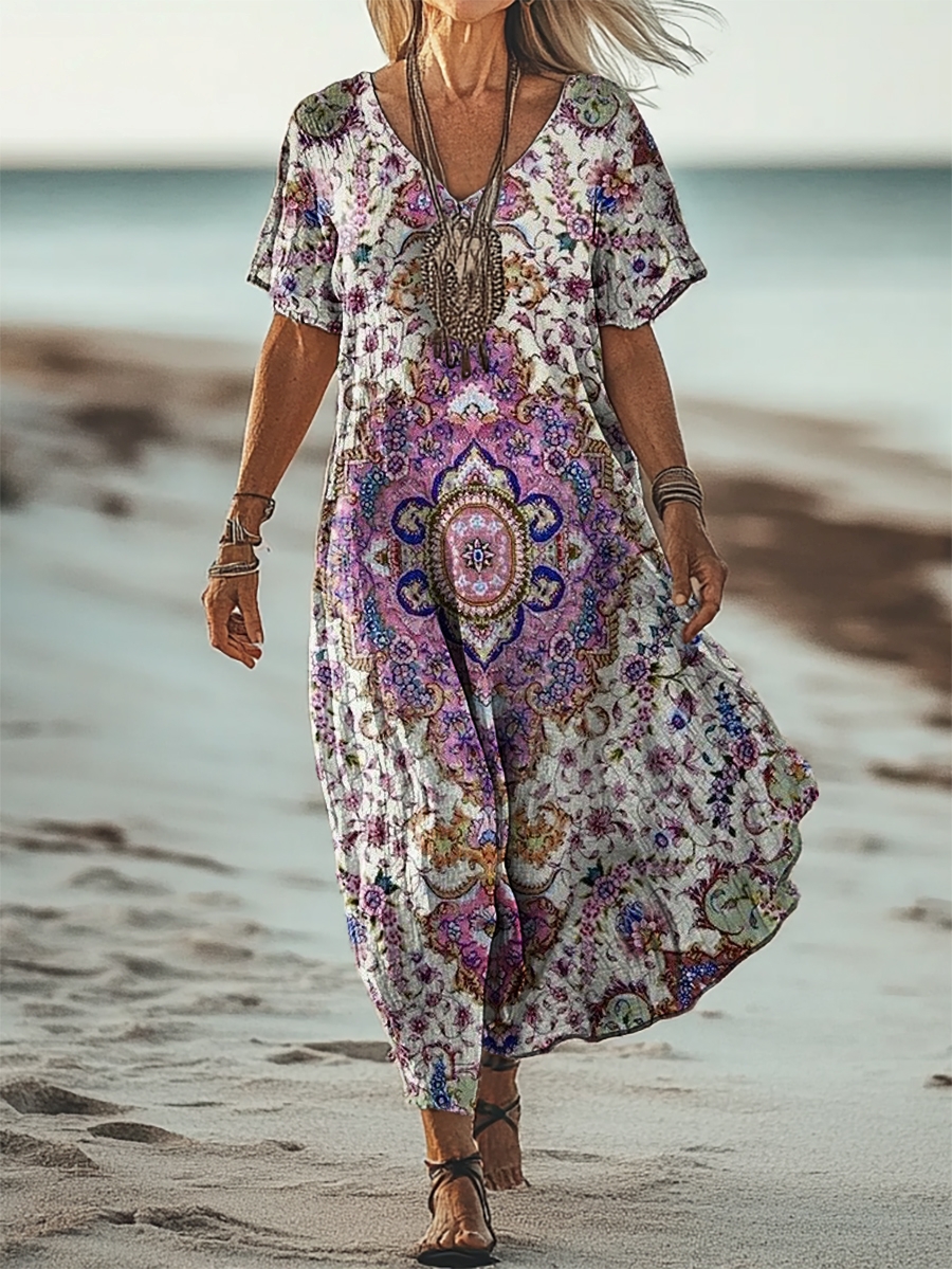 Women's Vintage Ethnic Totem Art Print V Neck Pocket Cotton Dress