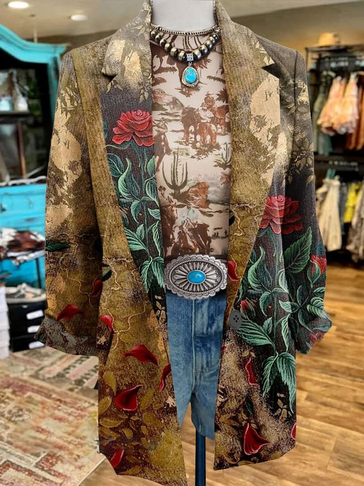 Women's Vintage Flower Contrast Print 3/4 Sleeve Casual Blazer