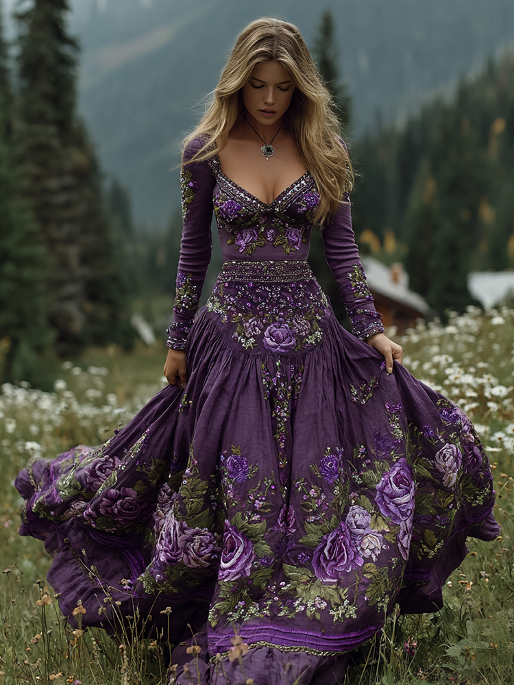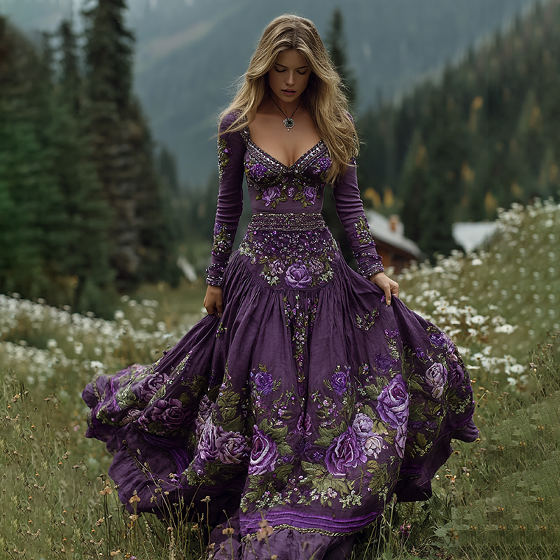 Women's Vintage Flowers Embroidery Art V-neck Maxi Dress