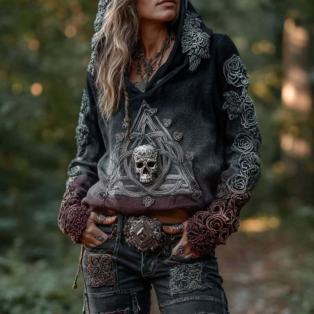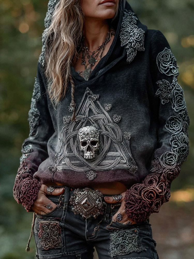 Women's Vintage Rose Skull Celtic Triangle Gradient Cotton And Linen Hoodie
