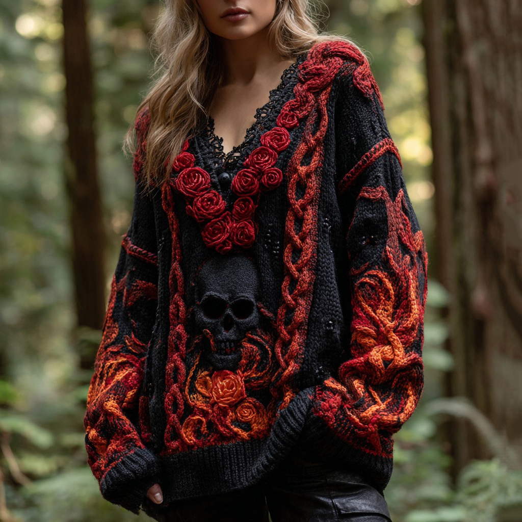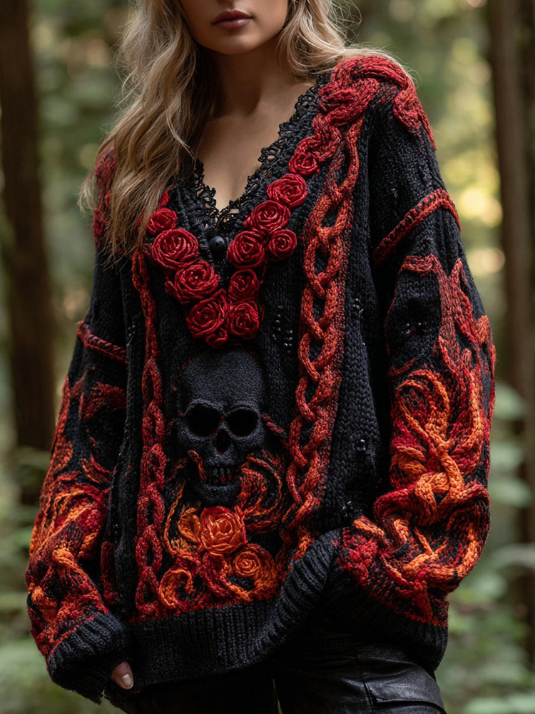 Women's Vintage Skull And Rose Knitted Warm V-neck Sweater