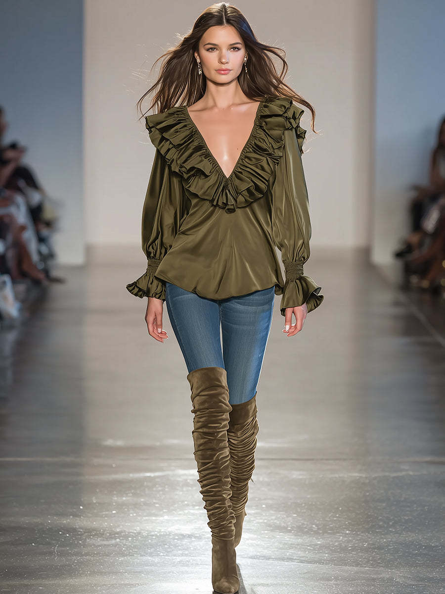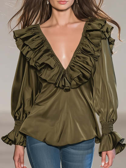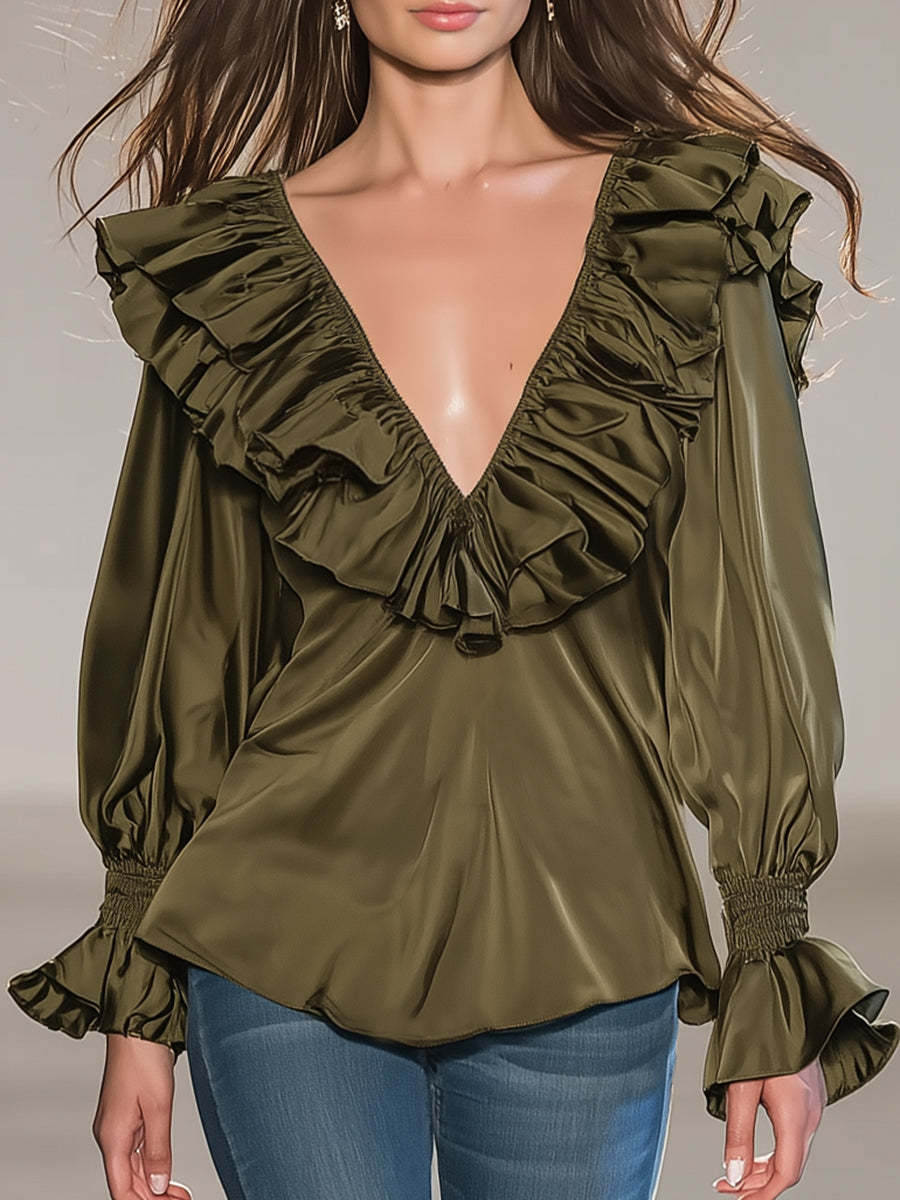 Casual And Stylish Ruffle Trim Olive Green V-neck Satin Shirt