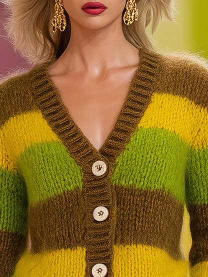 Casual Brown And Yellow-green Striped Knit Cardigan