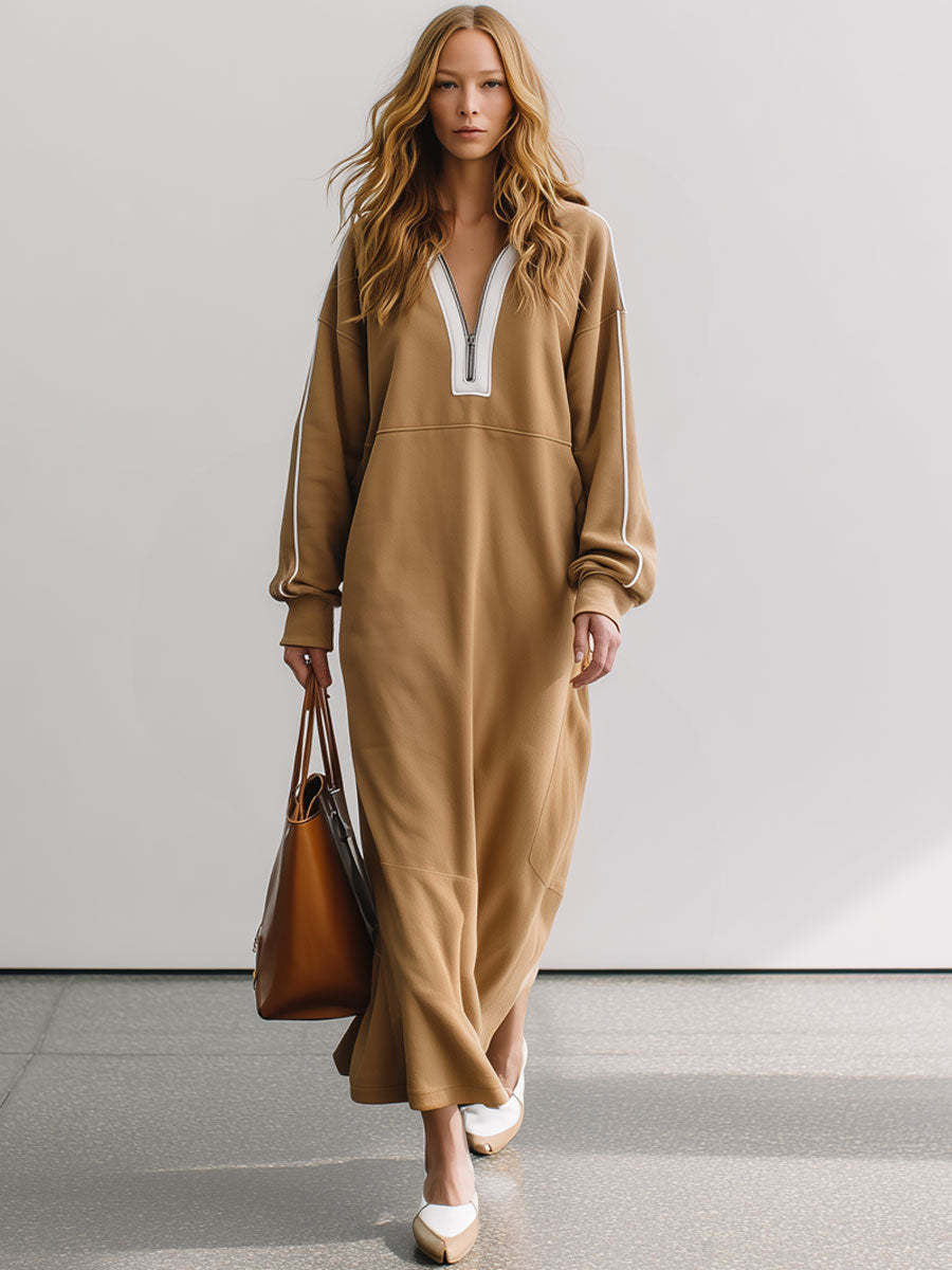 Casual Retro Half-zip Camel Cotton Fleece Slit Sporty Maxi Dress