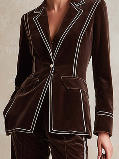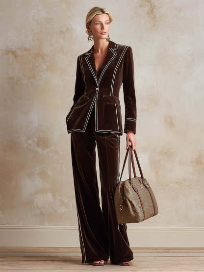 Classic Urban-style Brown Velvet Blazer With Wide-leg Trousers Suit