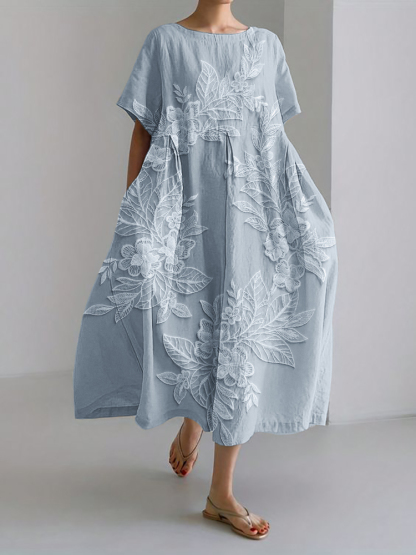 Classy 3D Floral Embroidered Lace Linen Blend Maxi Dress