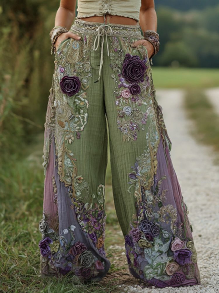 Classy Purple Lavender And Floral Embroidered Art Linen Pants