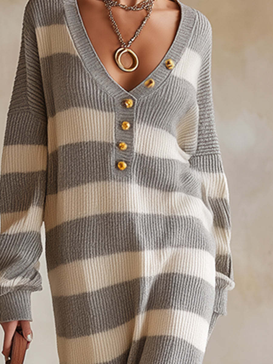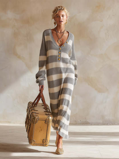 Cozy And Lazy V-neck Gray And White Striped Knitted Maxi Dress