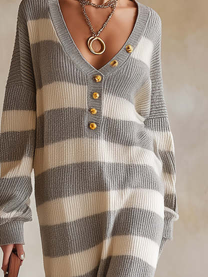 This comfortable and relaxed V-neck grey and white striped knit maxi dress perfectly embodies casual elegance. Designed for those who seek comfort without sacrificing style, it's the ideal choice for leisure time and effortless looks. The soft knit fabric and soothing color scheme seamlessly blend comfort and fashion.