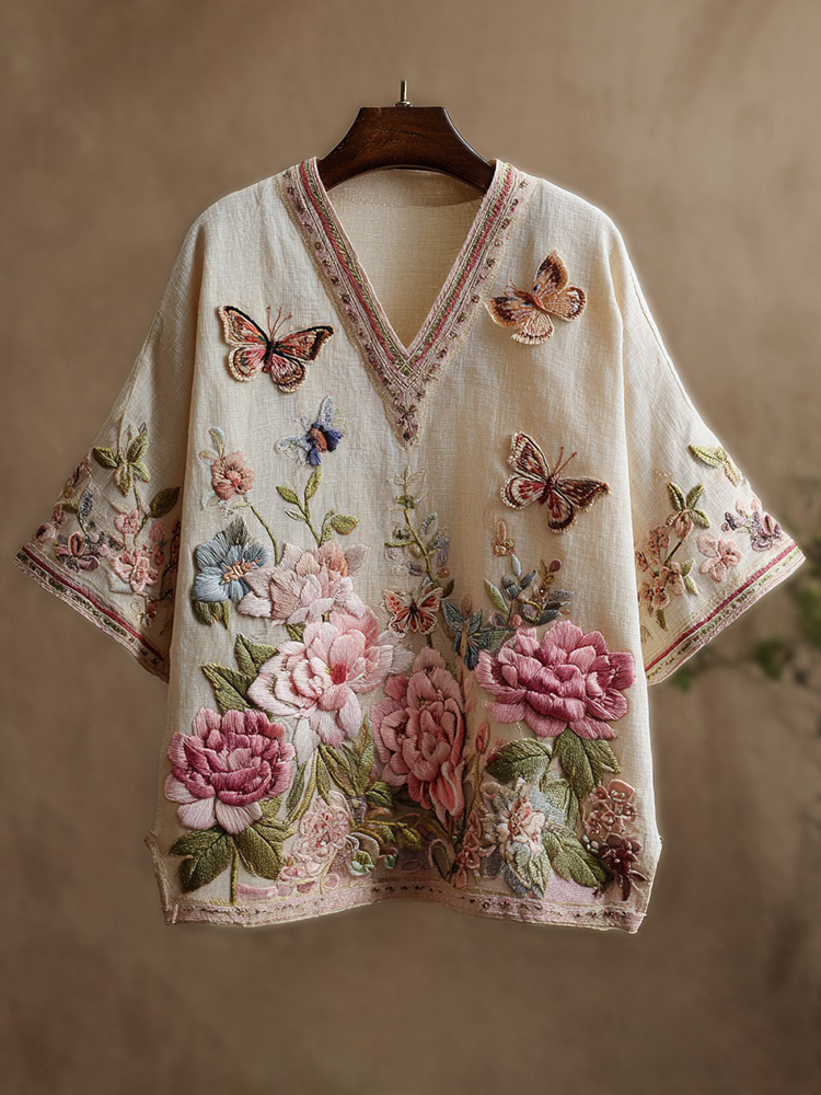Cozy Pink Floral Butterfly Embroidery Short Sleeve Linen Three-quarter Sleeves Shirt